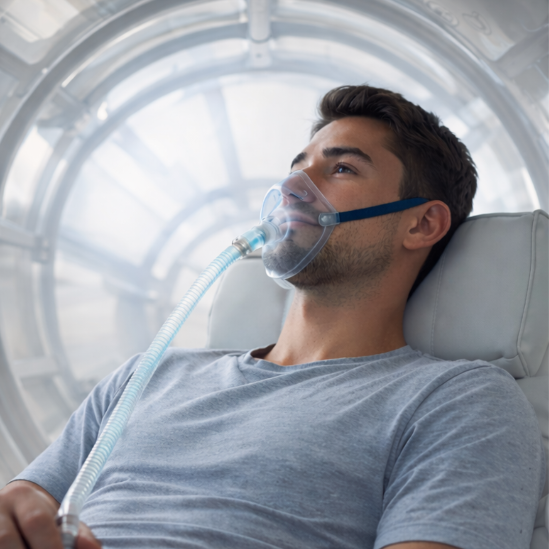 Hyperbaric Oxygen Therapy involves breathing oxygen within a pressurised environment, increasing oxygen availability at a cellular level.